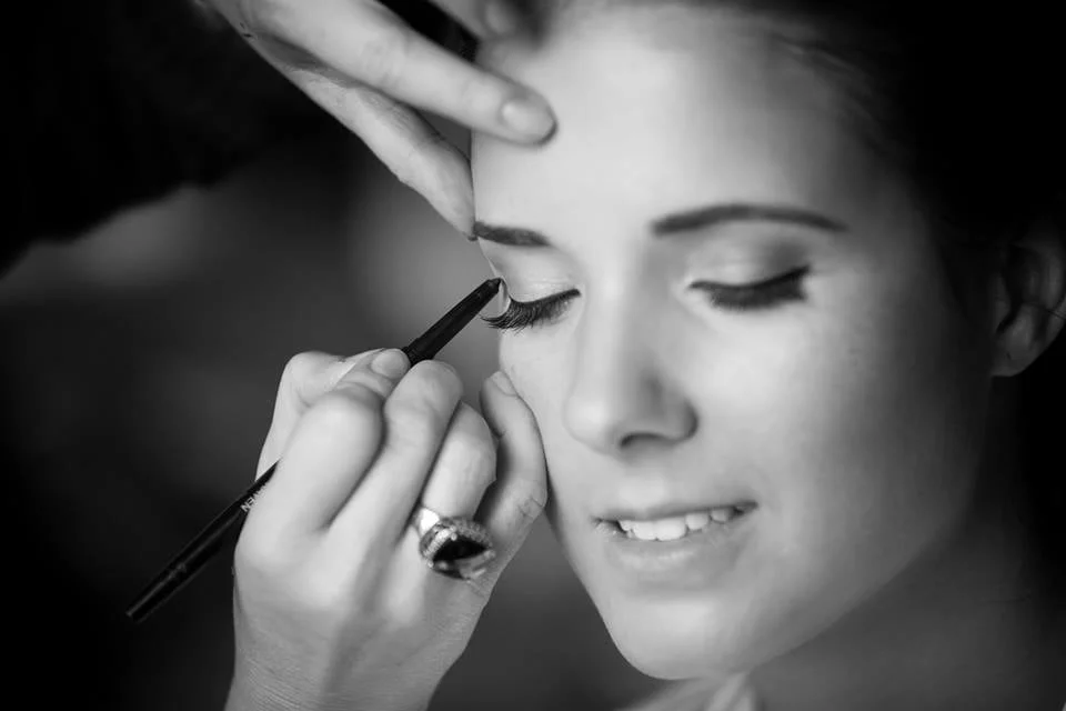 We used soft peachy tones on her eyes and lips to create this monochromatic look.